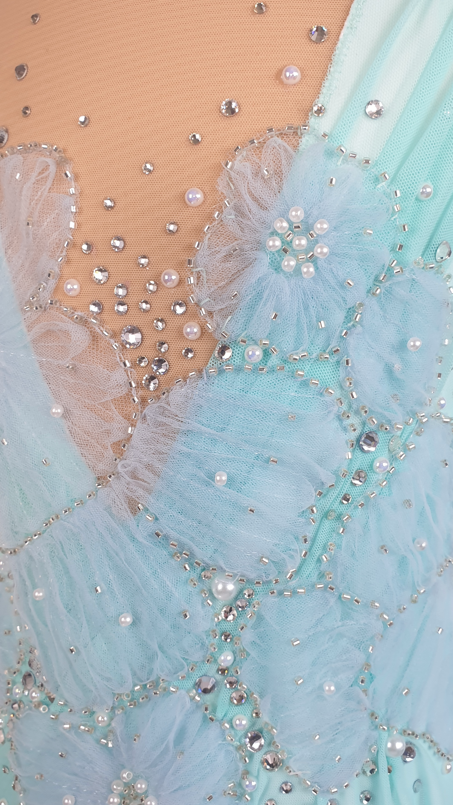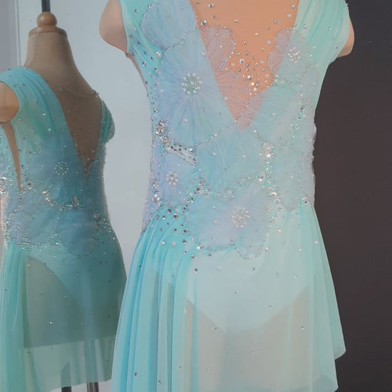Step into the spotlight in this ethereal aqua leotard, adorned with cascading chiffon, oversized floral appliqués, and sparkling crystals. A deep illusion back adds a touch of drama, while the asymmetrical skirt flows with every motion. A perfect blend of softness and power, designed to mesmerize from every angle.