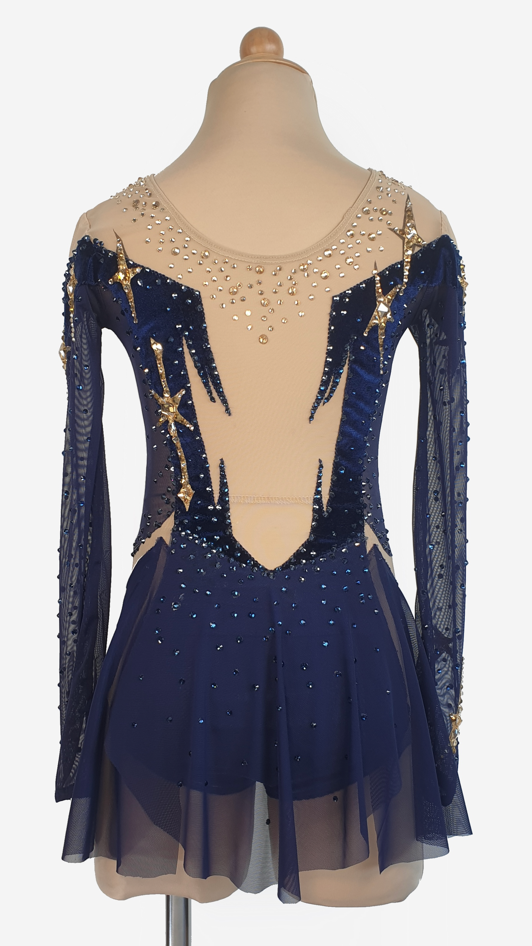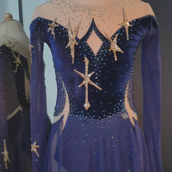 The Blue Star Leo is an exquisite leotard that captures the brilliance of the night sky. Designed in deep navy velvet, this piece is adorned with shimmering crystal embellishments that form dazzling starbursts across the bodice and sleeves. The illusion neckline and nude mesh inserts create a striking contrast, highlighting the intricate hand-placed rhinestones and metallic gold appliqués. The asymmetrical cut and delicate sheer fabric add movement and grace, making it perfect for gymnasts or performers who want to shine on stage. With its celestial-inspired details and sophisticated silhouette, the Blue Star Leo embodies elegance, strength, and brilliance.