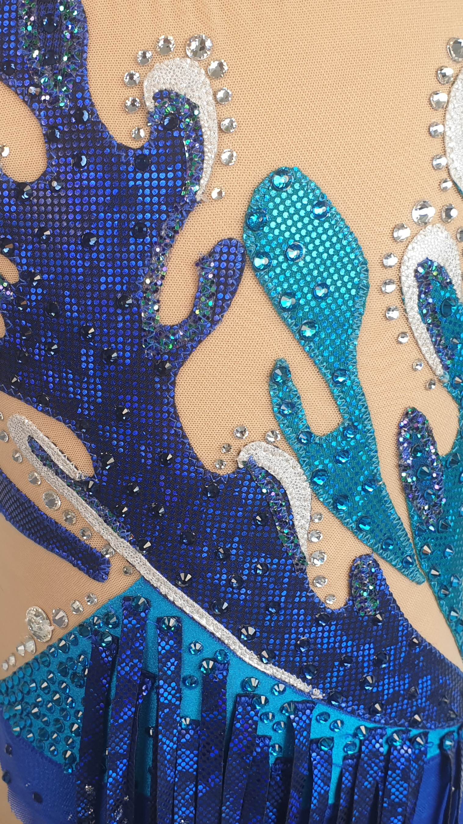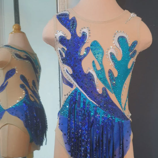 Dive into elegance with this ocean-inspired leotard, featuring bold blue sequins shaped like crashing waves. Crystal outlines highlight the movement, while long fringe adds flow and sparkle with every step. Perfect for routines that embody strength and fluidity, this design captures the energy of the sea in dazzling style.