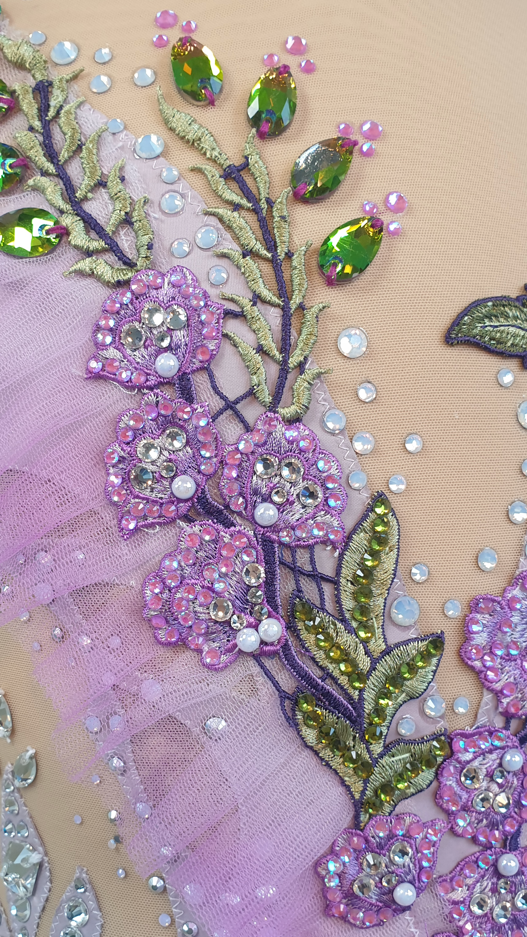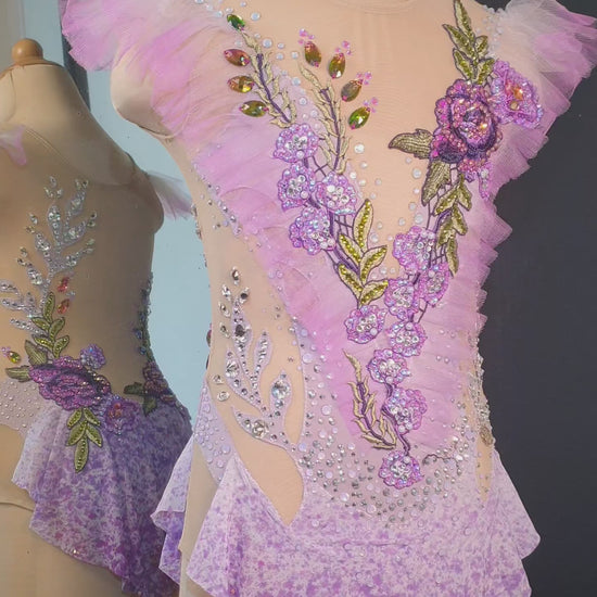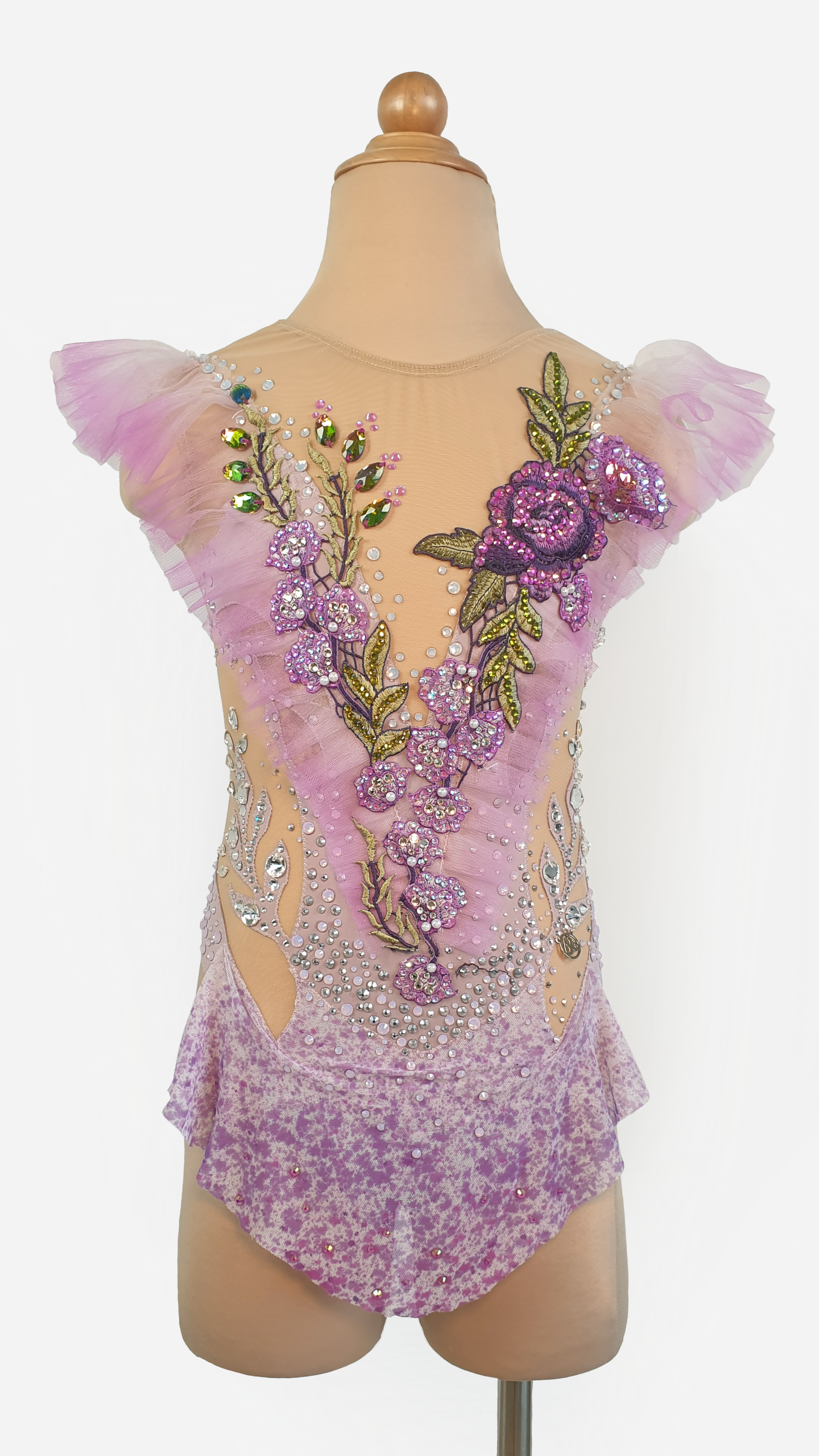 Delicate and enchanting, this lavender leotard blossoms with 3D floral appliqués and cascading rhinestone vines. Soft tulle ruffles frame the shoulders for a dreamy touch, while the velvet-effect gradient bottom adds depth and elegance. Perfect for gymnasts who want to perform with grace, femininity, and unforgettable stage presence.