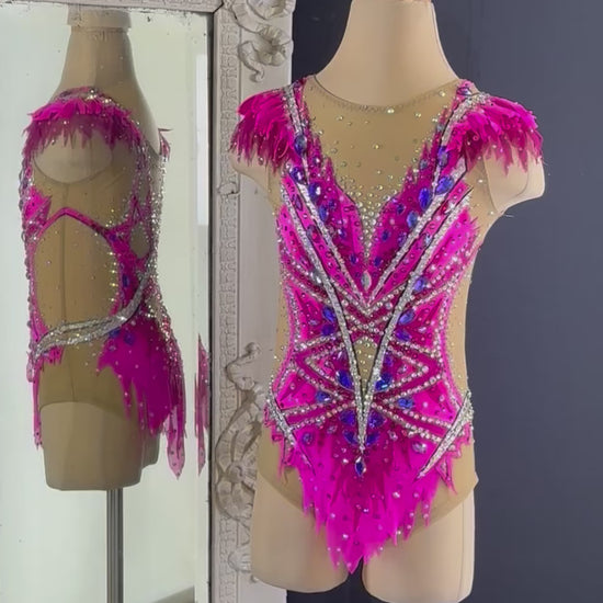 Turn heads on the competition floor with this striking fuchsia leotard, featuring vibrant feathered shoulder accents, dazzling crystal embellishments, and bold geometric detailing. Designed to sparkle under the spotlight, this piece combines elegance and power — perfect for gymnasts who want to make a statement.