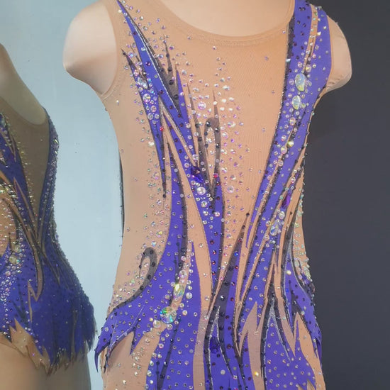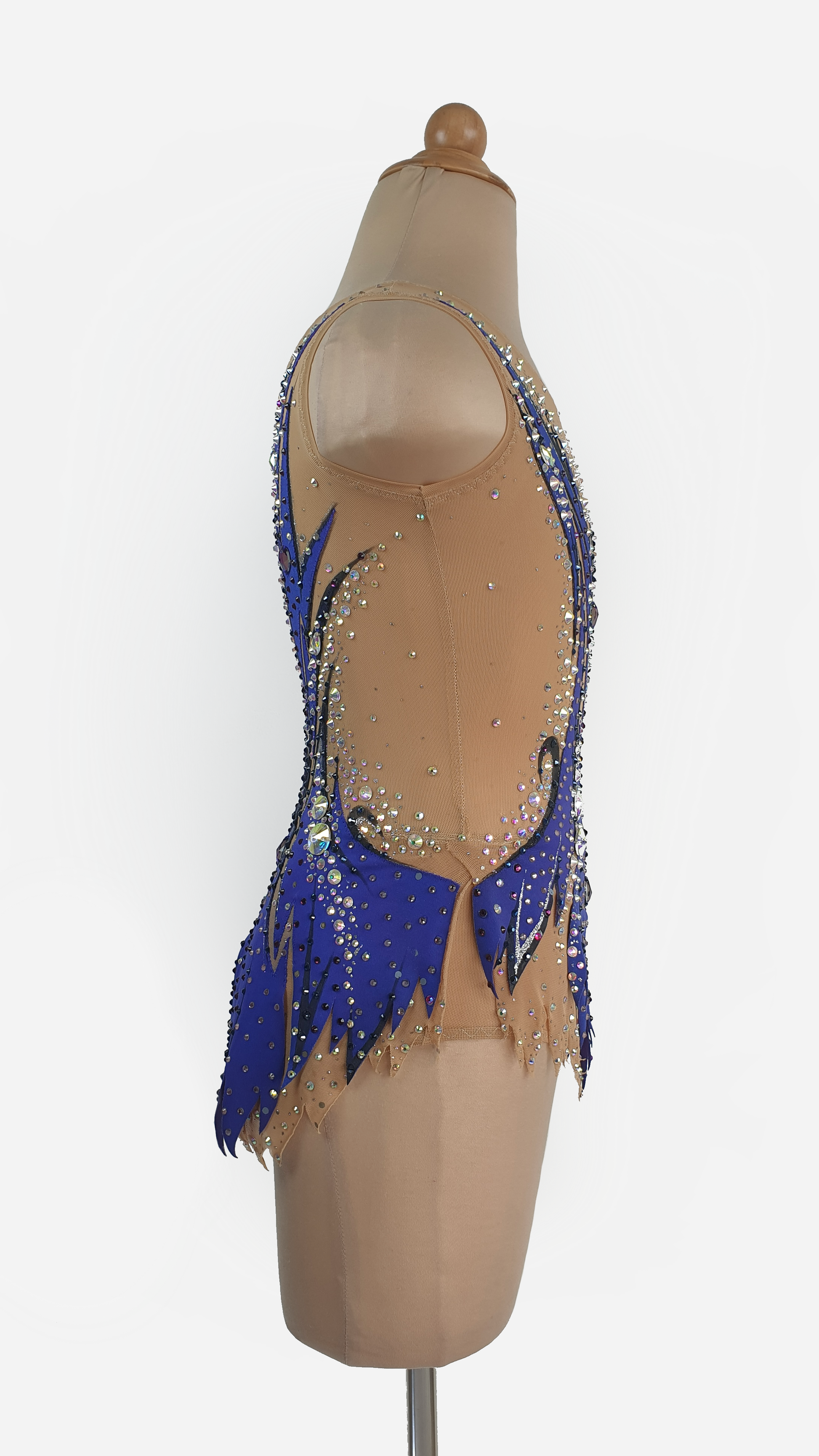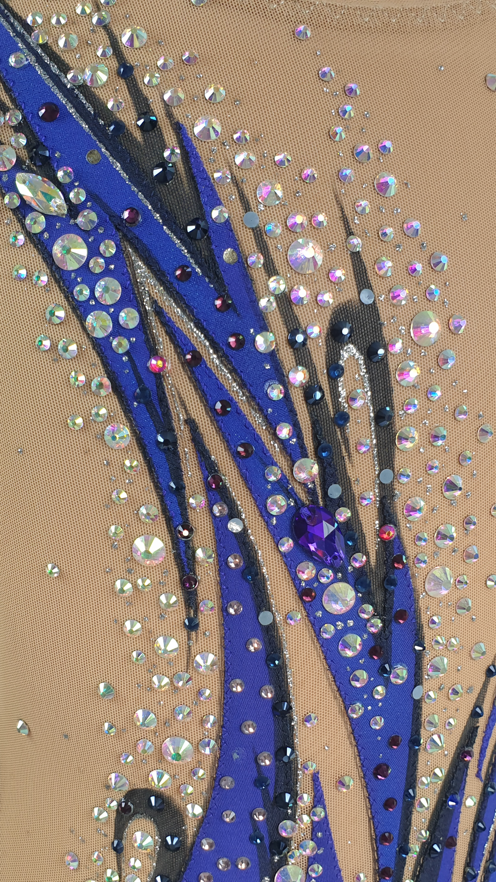 Elegant and commanding, this royal blue leotard features golden wave patterns adorned with sparkling crystals. The sweeping design contours the body, enhancing lines and movements with fluid precision. Both powerful and sophisticated, this design blends athletic strength with refined glamour, ensuring gymnasts leave a lasting impression on stage.