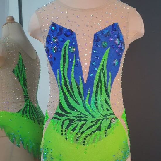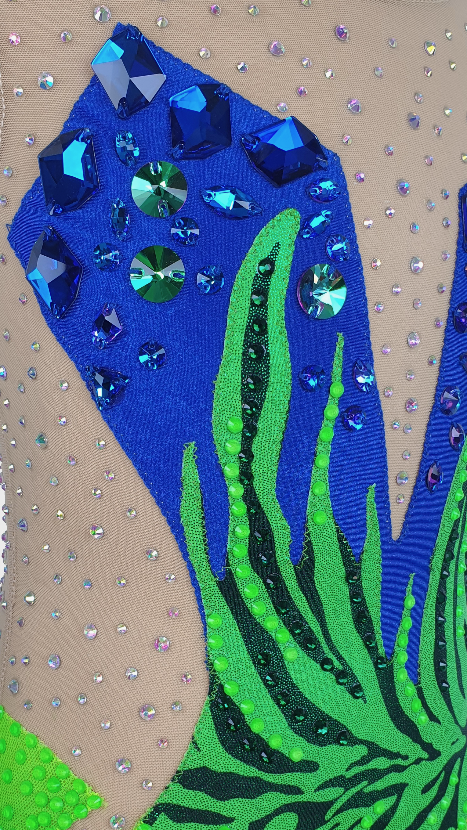 Turn heads with this electrifying Neon Green & Blue Leo, a bold statement piece designed for gymnasts and performers who love to shine. Featuring a striking combination of deep blue and vibrant green, this leotard is adorned with dazzling rhinestones and sequin embellishments for maximum sparkle. The intricate black zebra-inspired pattern adds a fierce, dynamic touch, while the nude mesh top is scattered with shimmering crystals, creating an elegant illusion. The layered, jagged skirt enhances movement and grace, making it perfect for competitions or performances. Stand out, own the stage, and radiate confidence in this show-stopping masterpiece!