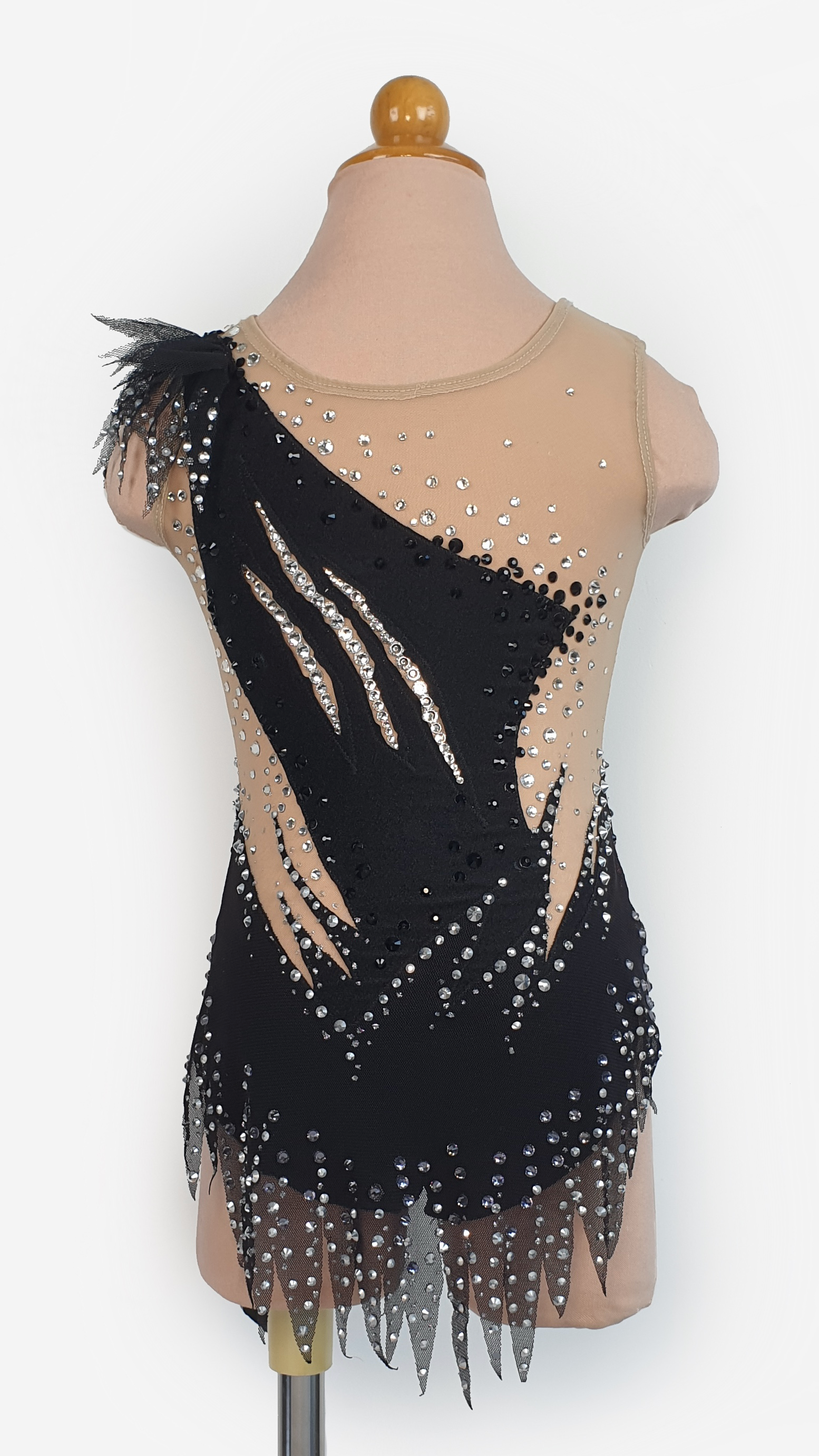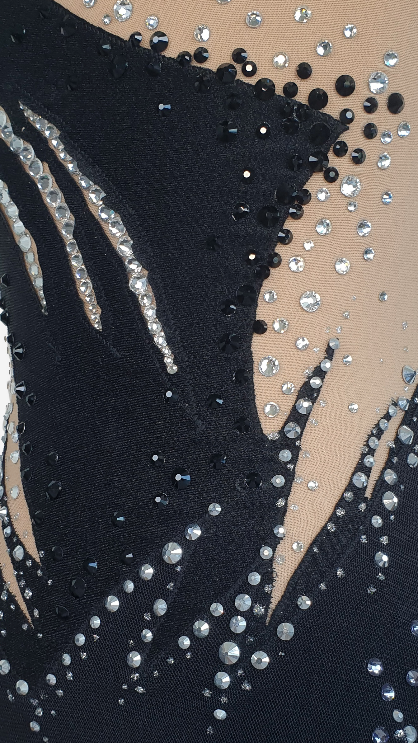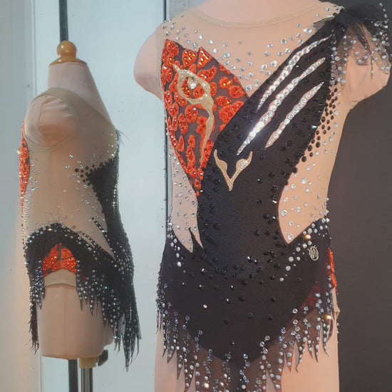 The Orange Black Tiger Eye leotard is a striking fusion of fierce elegance and bold artistry. Inspired by the intensity of a tiger’s gaze, the asymmetrical design features fiery orange sequins with a black claw-like overlay, symbolizing strength and agility. Gold accents highlight the eye motif, creating a mesmerizing focal point. The sheer nude base enhances the illusion of movement, while hand-placed crystals and feathered details add depth and drama. The back continues the dynamic design with sleek claw slashes, embodying power and grace. Perfect for performers who want to command attention with confidence and style.