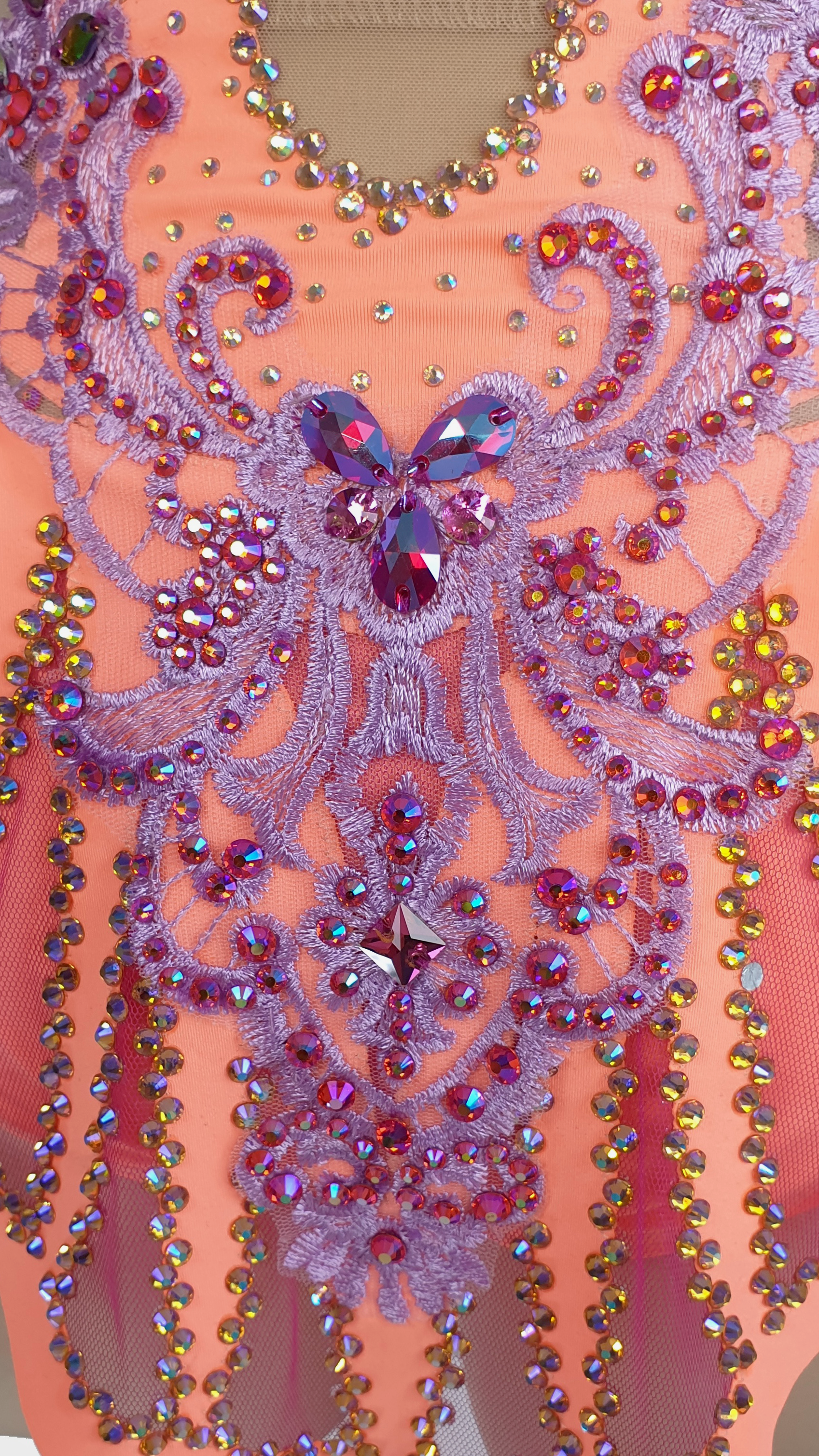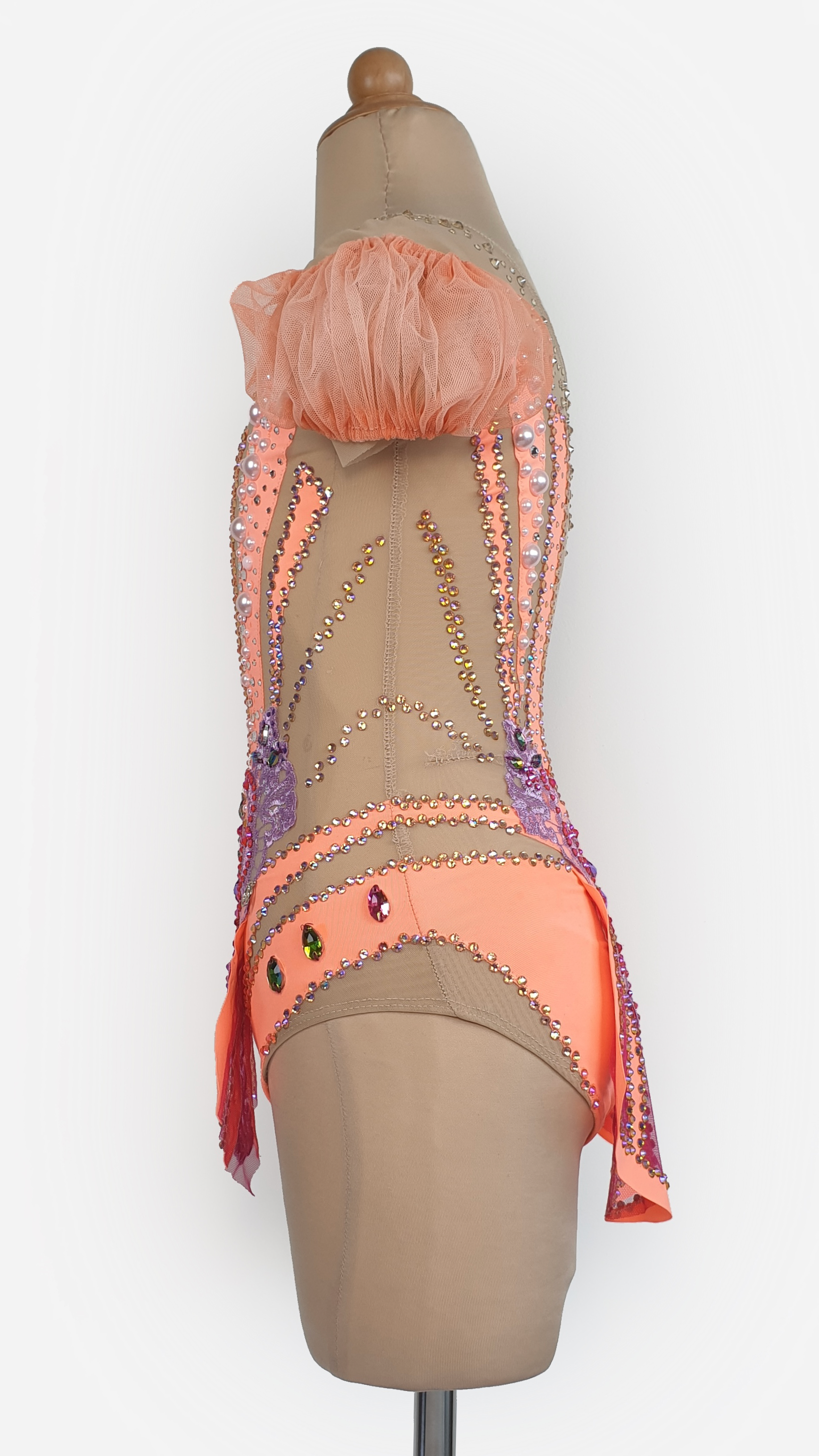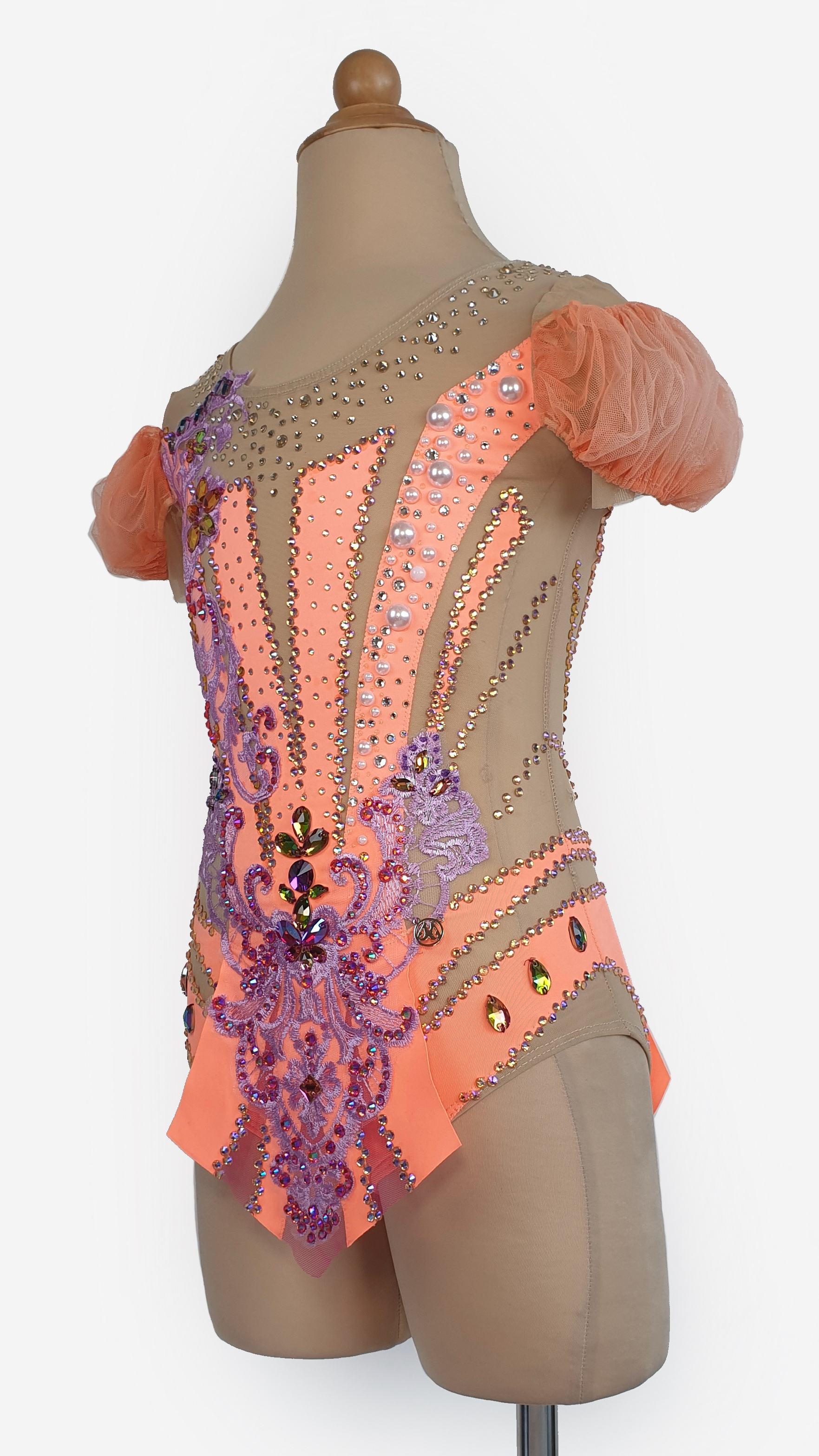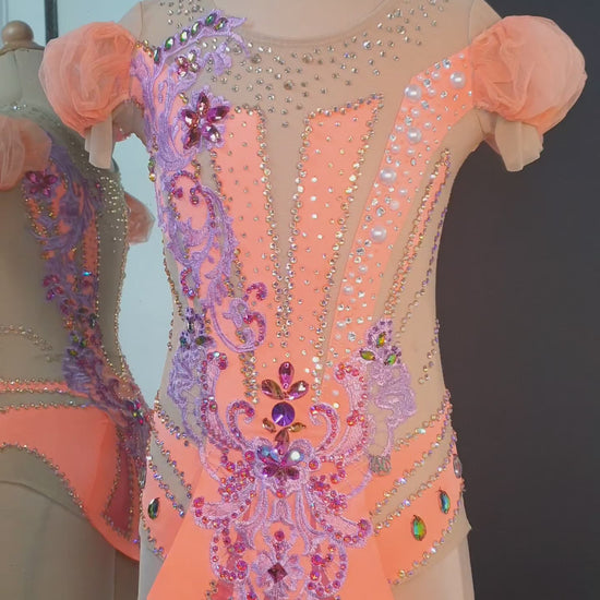 This stunning peach lace leotard is perfect for gymnasts, dancers, or performers looking to shine on stage. Designed with a nude mesh base for an elegant illusion effect, it features intricate purple lace appliqués, shimmering rhinestones, and delicate pearls for a dazzling touch. The soft tulle puff sleeves add a hint of romance, while the back showcases an open-cut design with ornate embellishments. Carefully handcrafted for comfort and style, this unique piece offers flexibility and support for movement. Elevate your performance with this beautifully detailed leotard that blends artistry and elegance effortlessly!