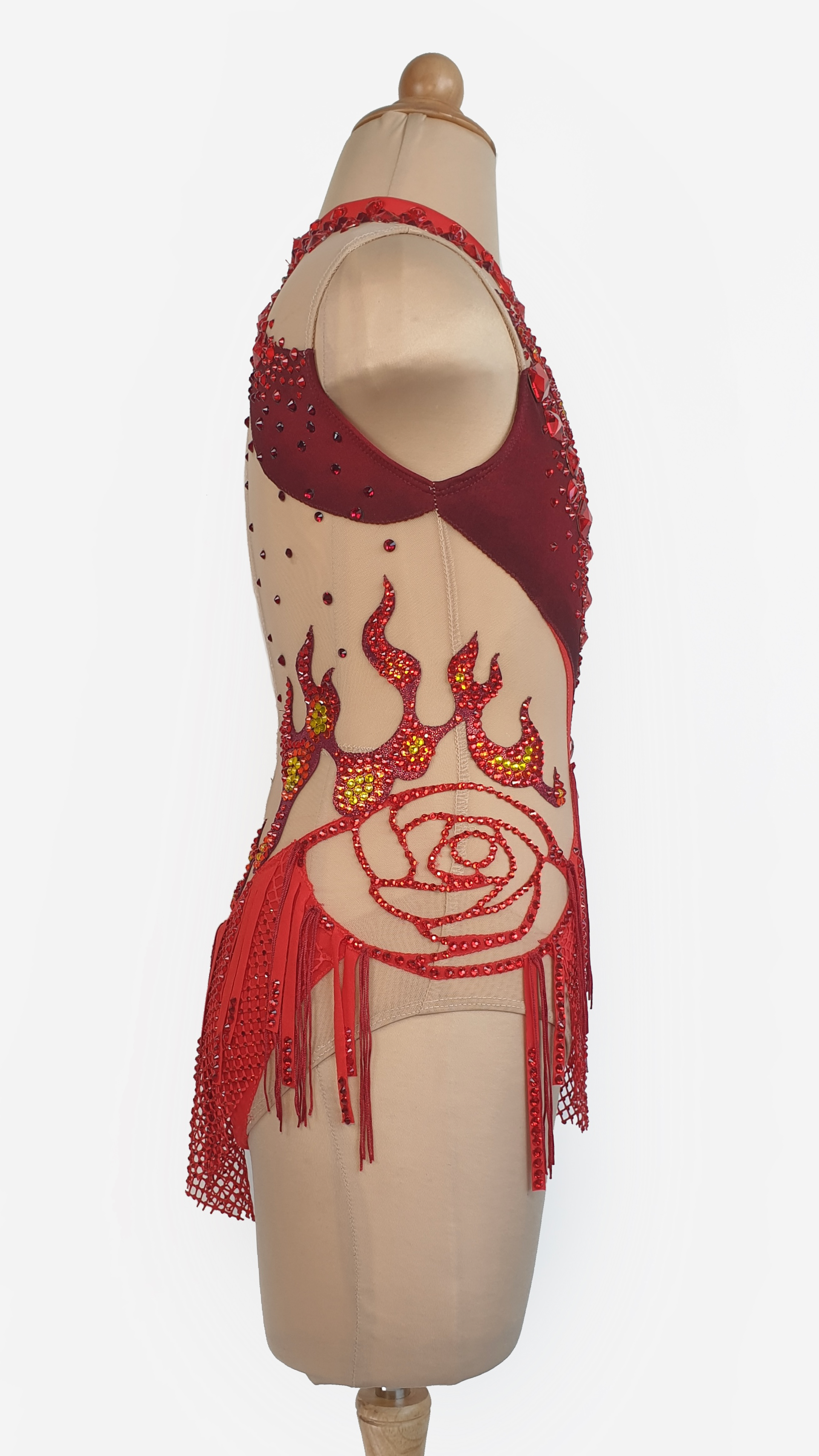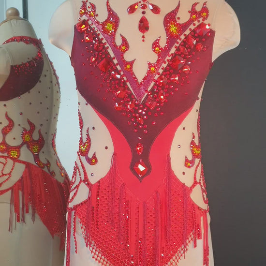Ignite the stage in this fiery red rhythmic gymnastics leotard, ablaze with rhinestone flames, bold cutouts, and dazzling mesh fringe. Featuring a rose motif and rich ombré tones, it’s designed to sparkle with every move—perfect for performances that demand passion, power, and unforgettable presence.
