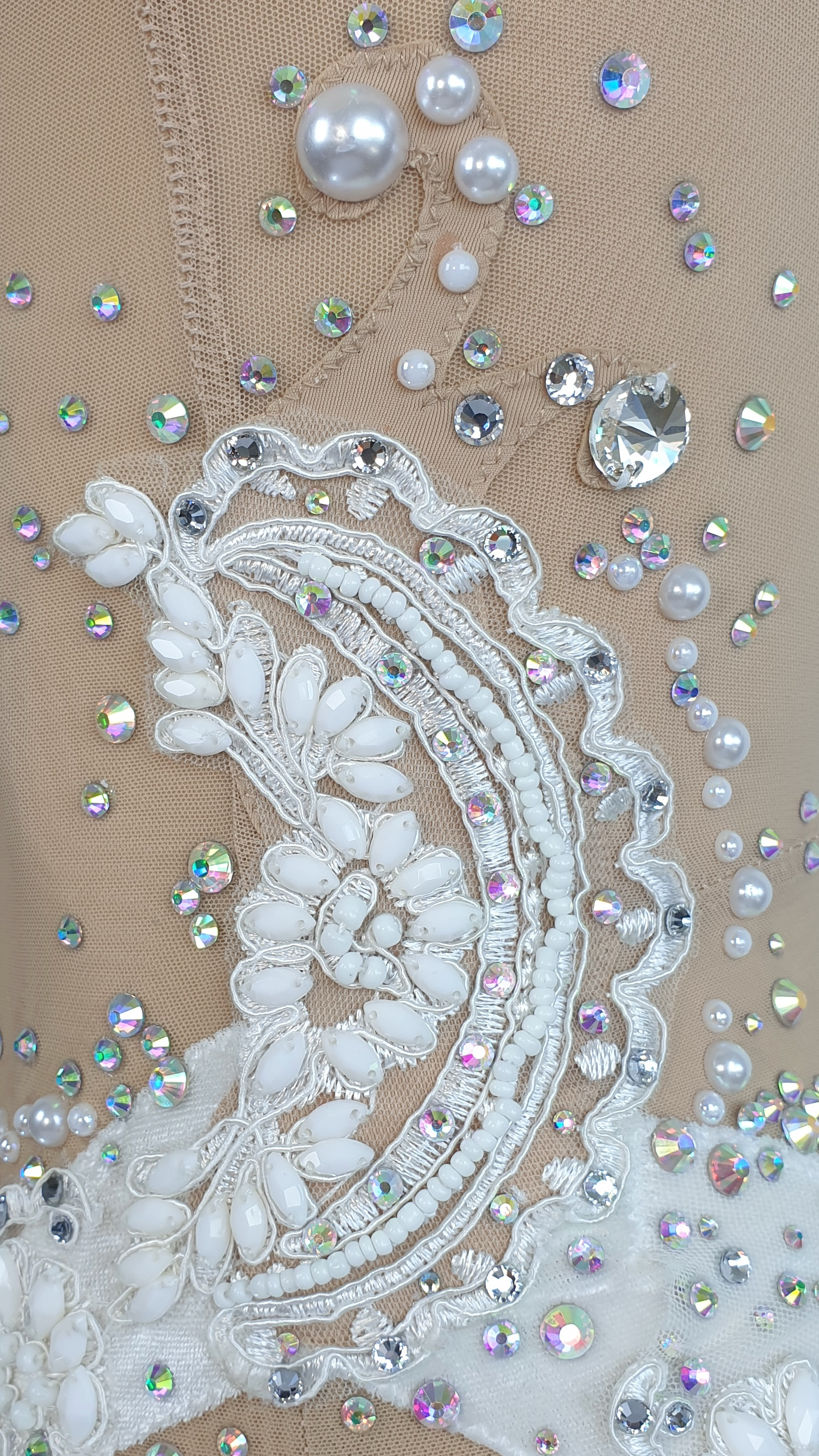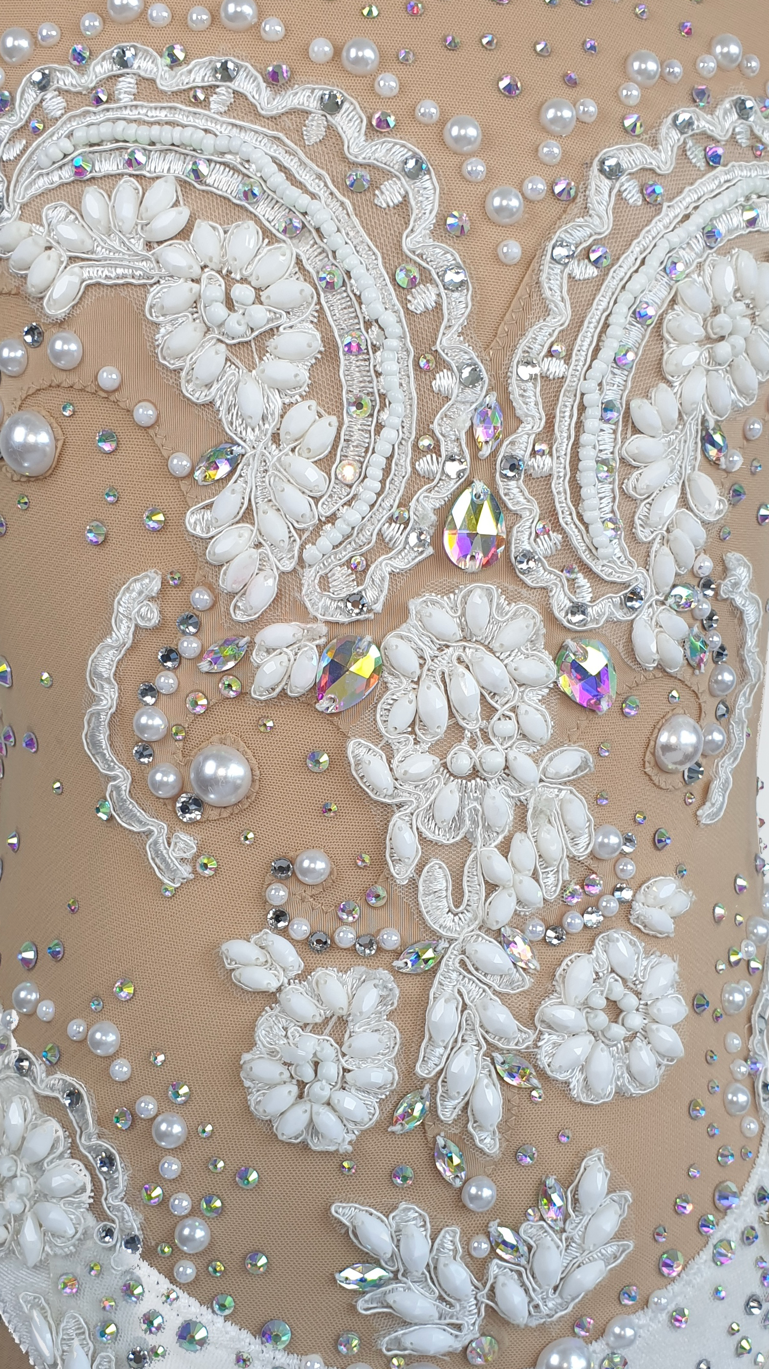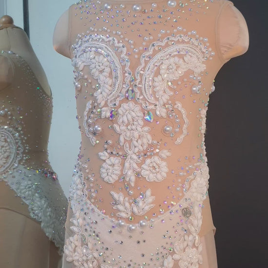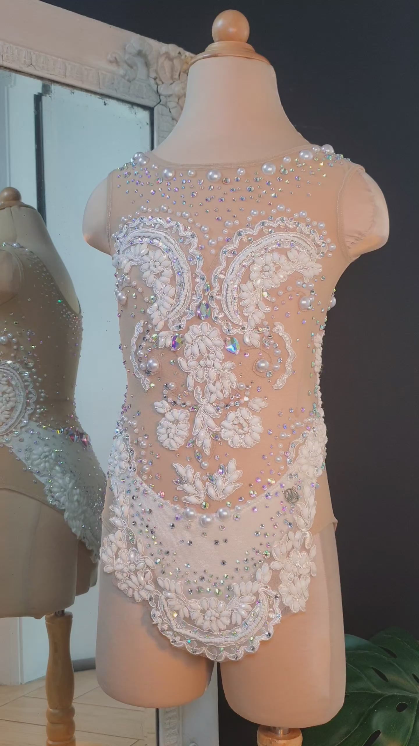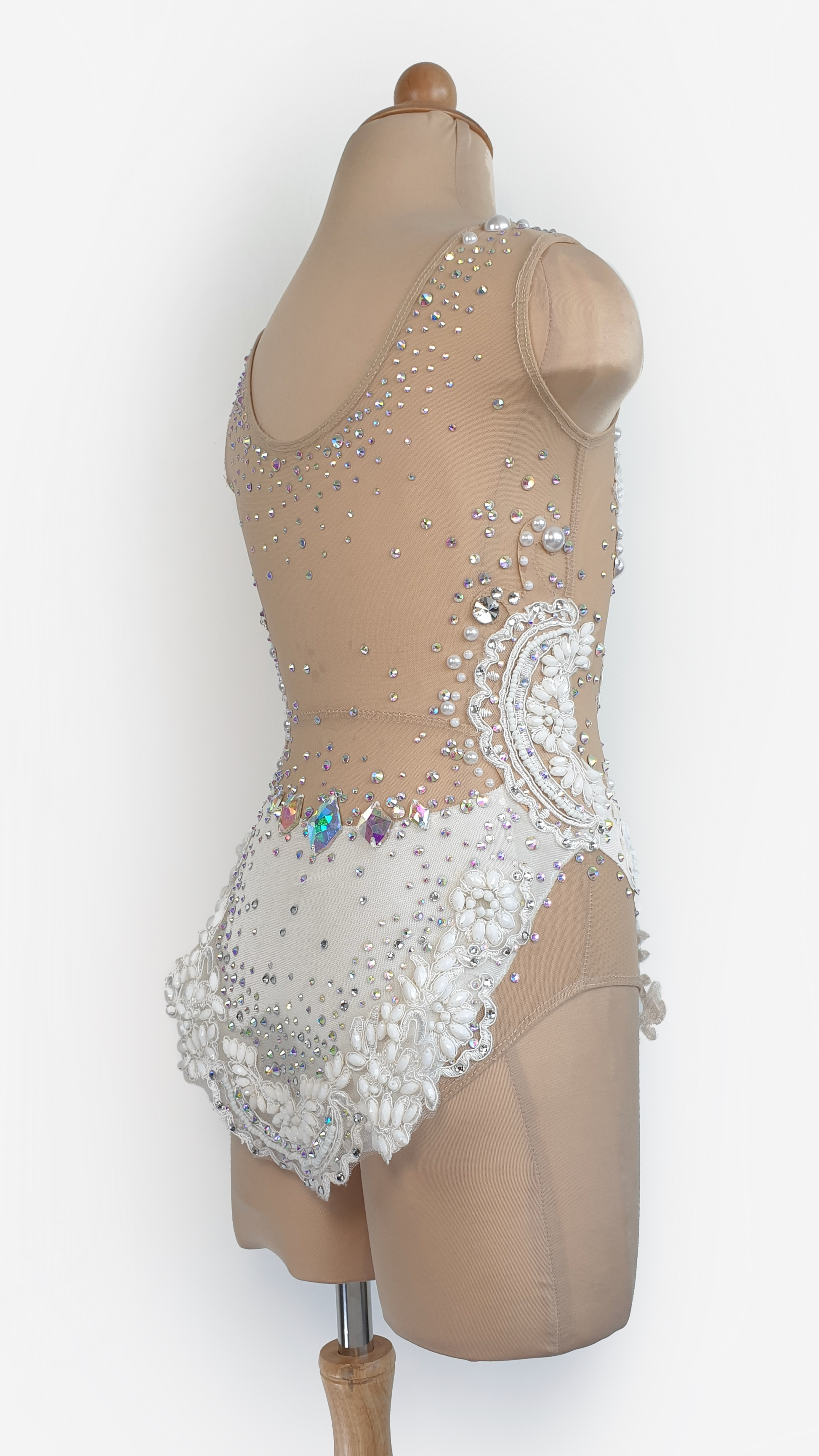 Experience elegance and grace with the White Lace Leo, a masterpiece designed for those who love sophistication in motion. This custom-made leotard features a nude illusion base adorned with exquisite white lace appliqués, delicately hand-stitched to create a regal pattern. Embellished with pearls and shimmering crystals, it catches the light beautifully, ensuring a breathtaking presence on stage or in competition. The intricate details continue at the back, offering a seamless blend of elegance and comfort. Perfect for dancers, gymnasts, and performers who want to shine with style, the White Lace Leo is available for made-to-order customisation to fit your unique vision.
